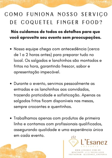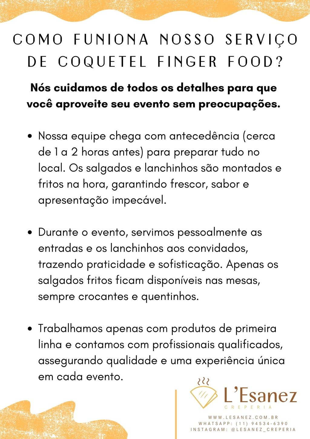 Agora transformamos qualquer ocasião em uma experiência única com nosso buffet de comidinhas no estilo coquetel Finger Food. Com cardápios exclusivos, ingredientes de primeira mão e toda sofisticação que você já conhece, garantimos sabor e praticidade para o seu evento. Perfeito para todas as ocasiões, nosso serviço de coquetel estilo Finger Food vai encantar seus convidados e deixar seu evento ainda mais especial.